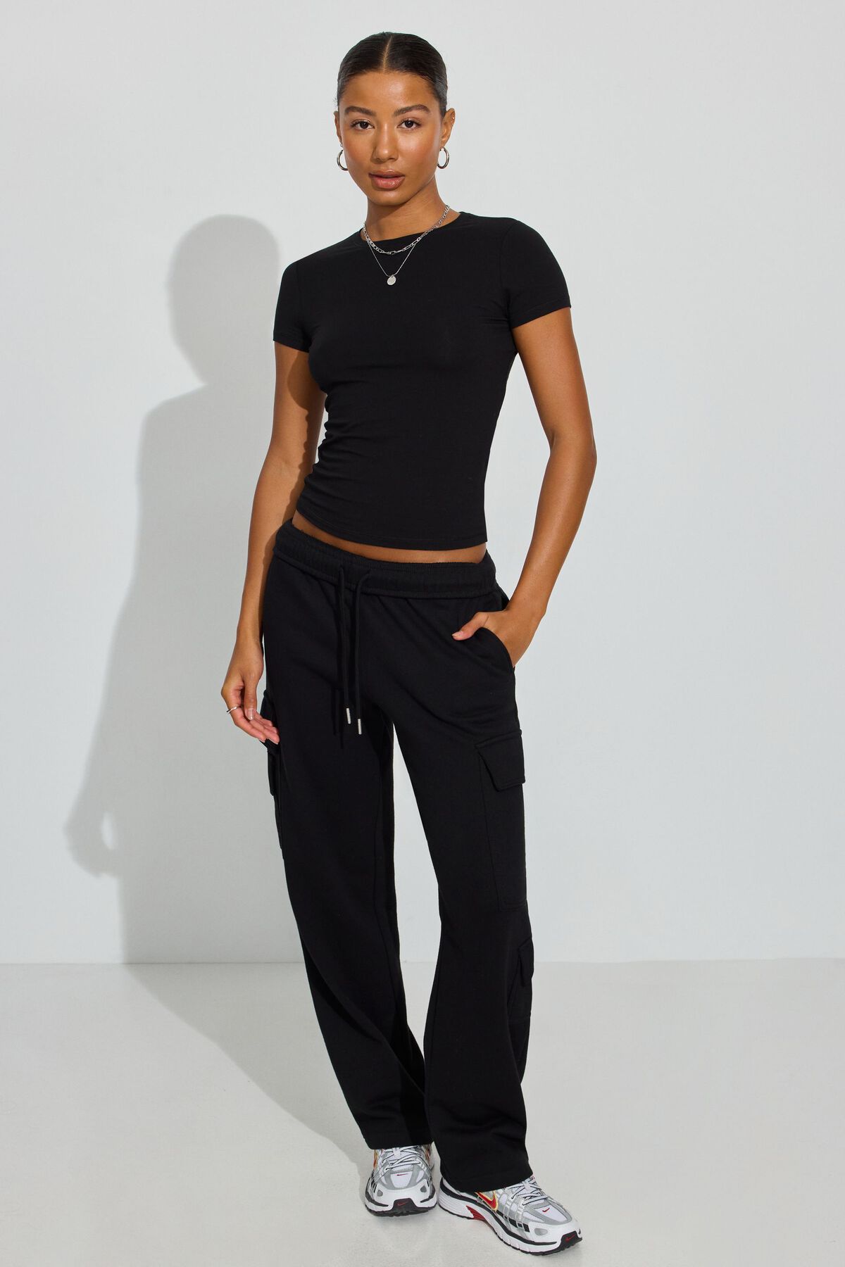 Estelle Longline Tee Black women – This style runs large. You may want to order a size down for a perfect fit 🙂 Your new go-to t-shirt . Features Crewneck Short sleeves Size & Fit Fit: Fitted Length: Longline Model is wearing size S Materials & Care Content: 66% cotton, 26% organic cotton, 8% spandex Care: Machine wash, cold Imported