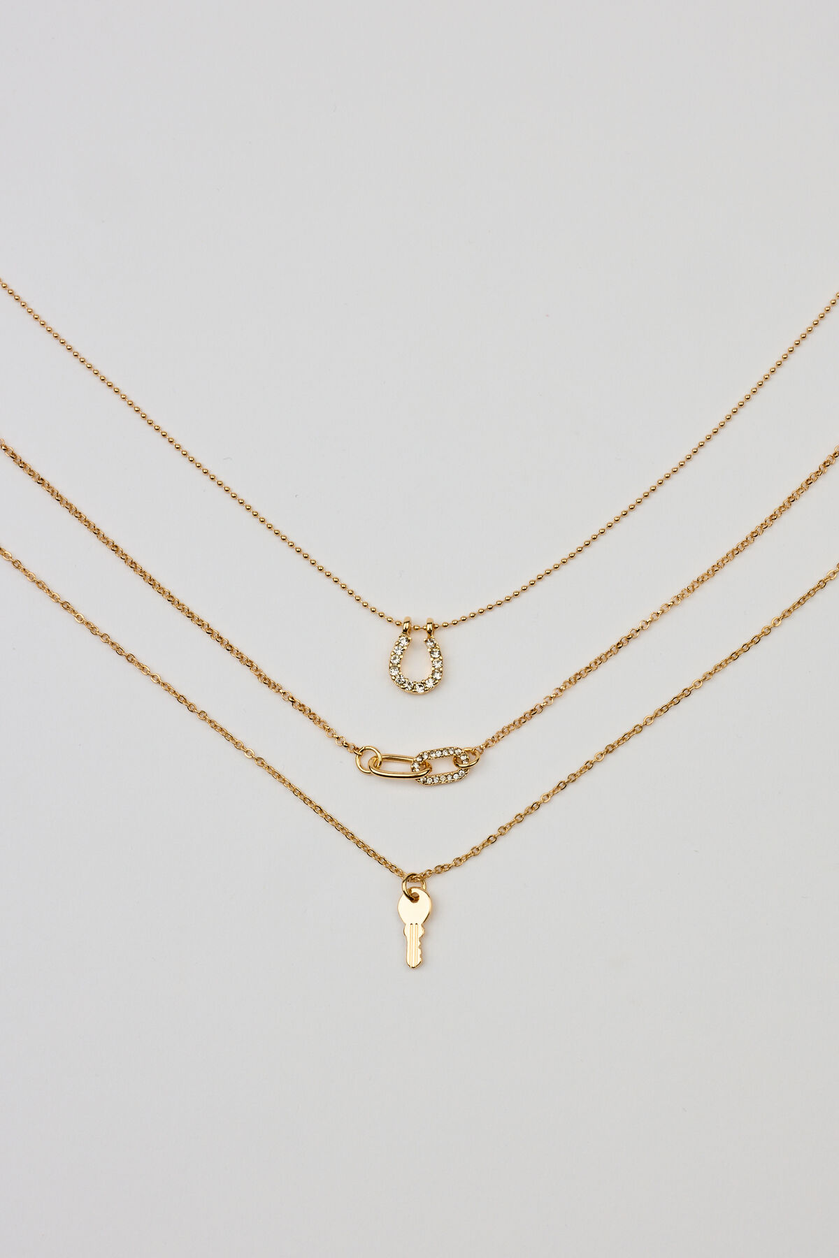 Set of 3 Key, Shoehorn & Link Necklaces White women – These cute charms are aligning with my vision board for this year… there are no coincidences. Features Chain link and bead chain necklaces Adjustable lobster clasp fastening Horseshoe, key, and link charms at drop Metal costume jewelry All jewelry is lead, nickel, and cadmium free Imported