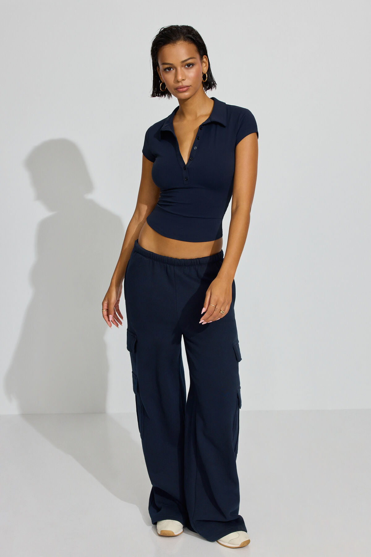 Sleek Short Sleeve Polo Top Navy women – Polo and sport leggings on, we’re so back. Features Spread collar Seven button placket Short cap sleeves Size & Fit Fit: Fitted Length: Cropped Materials & Care Content: 60% nylon, 20% recycled nylon, 20% spandex Care: Machine wash, cold Imported